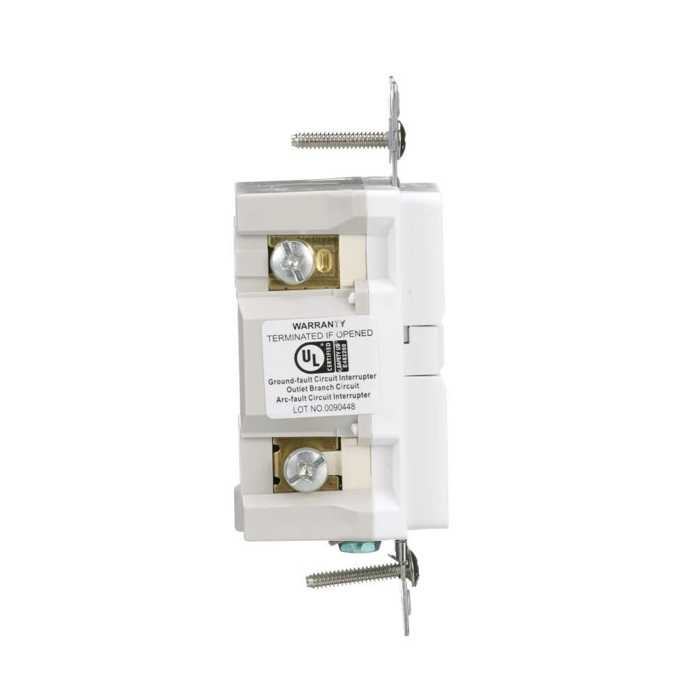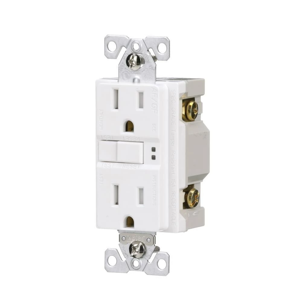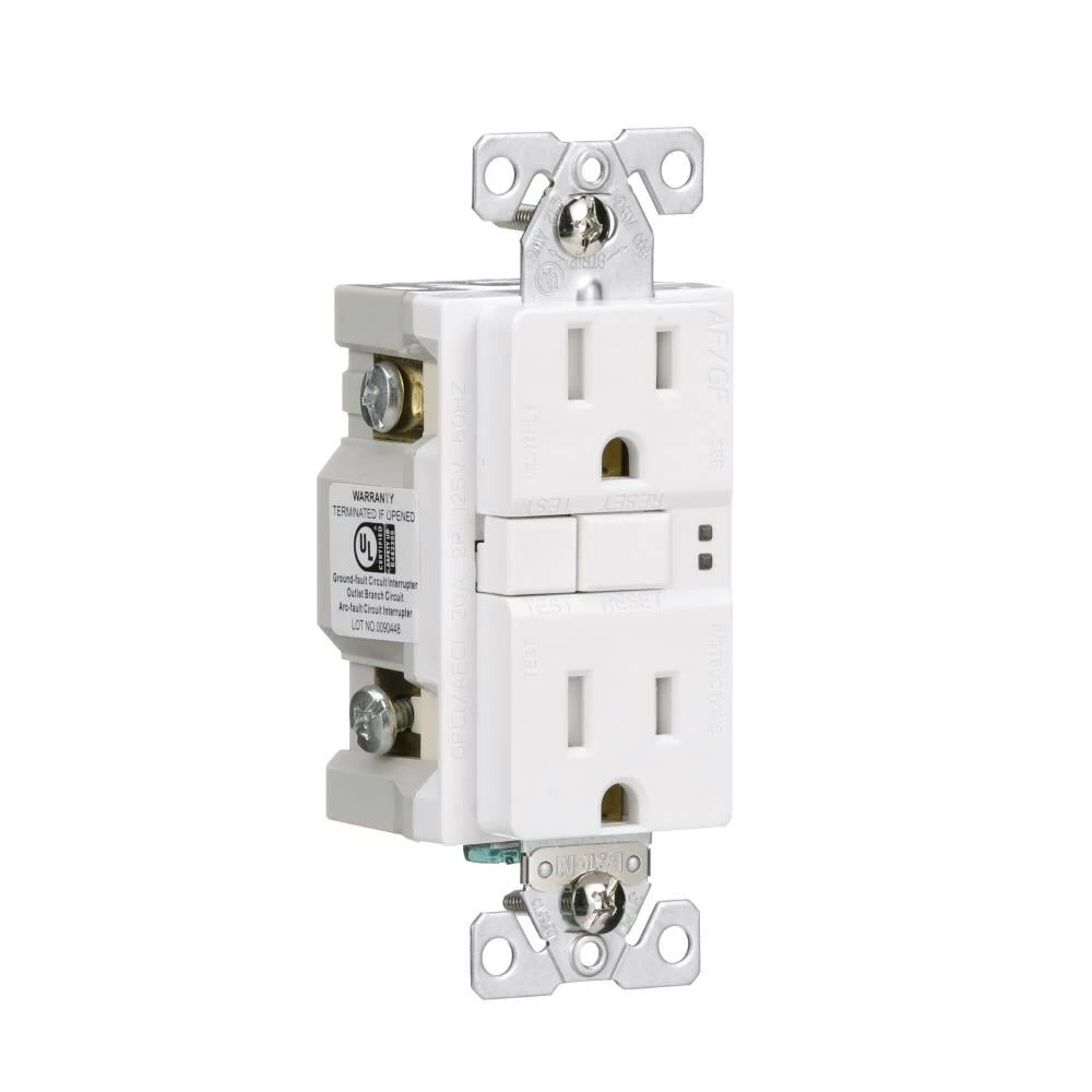 - White finish TR AFCI/GFCI receptacle offers a 15-amp, 125-volt capacity for long-term indoor use