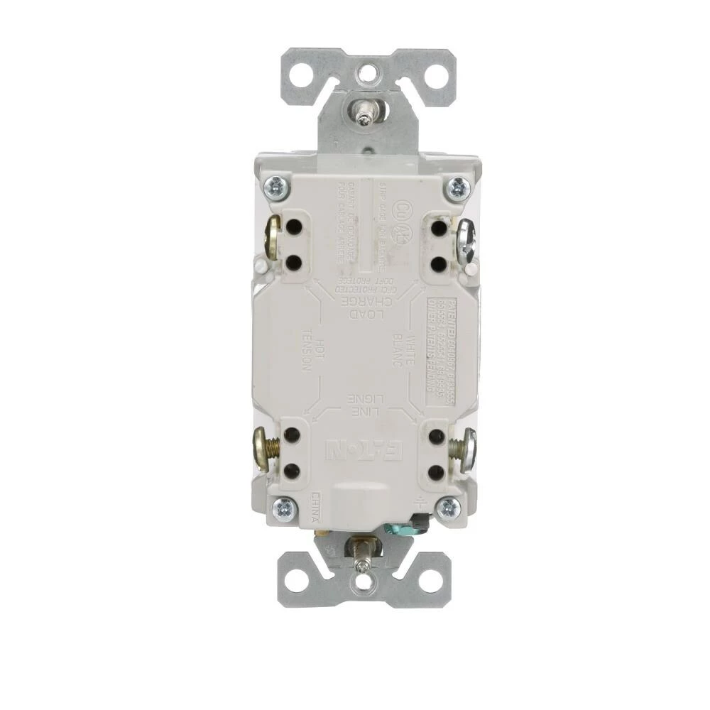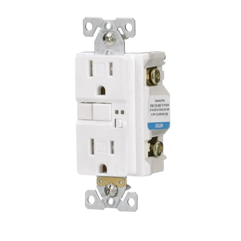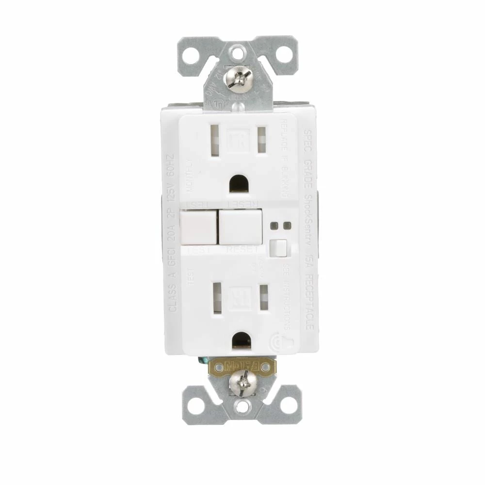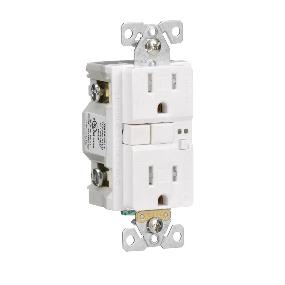 - White finish audible TR GFCI receptacle offers a 15-amp, 125-volt capacity for long-term indoor use