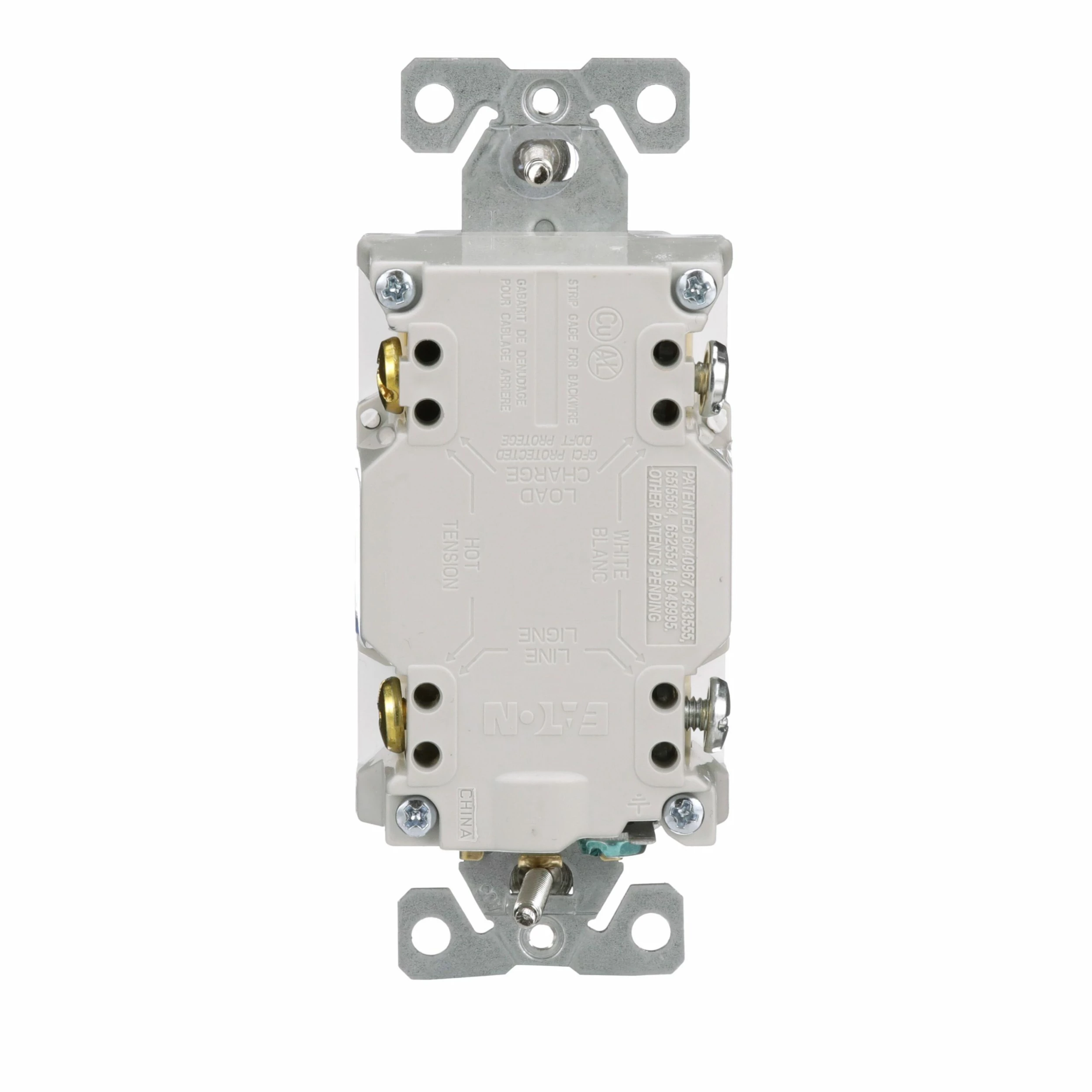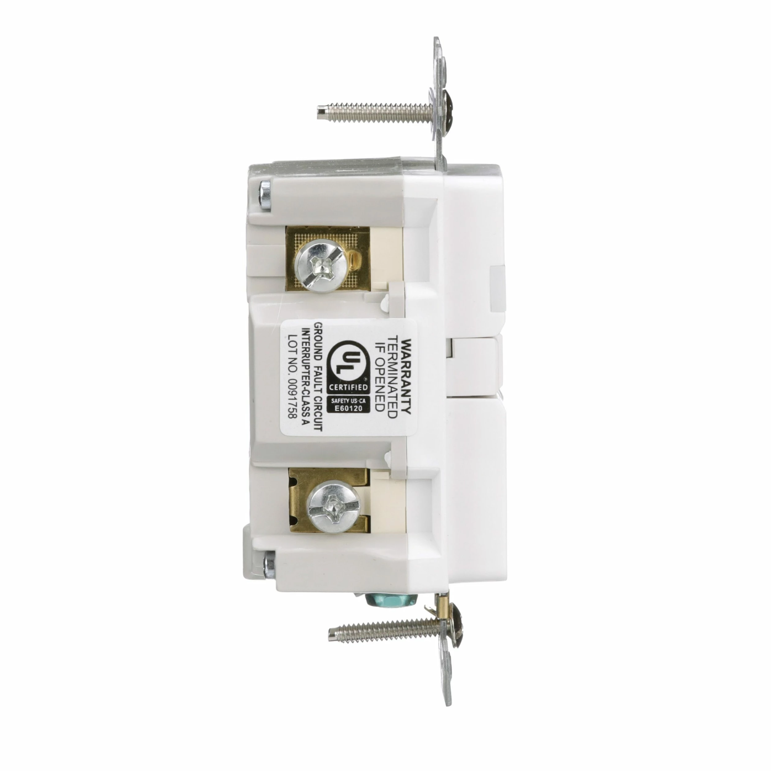 - White finish combination nightlight GFCI receptacle offers 15A, 120V capacity designed to provide electric shock protection and safe way-finding in dimly lit rooms