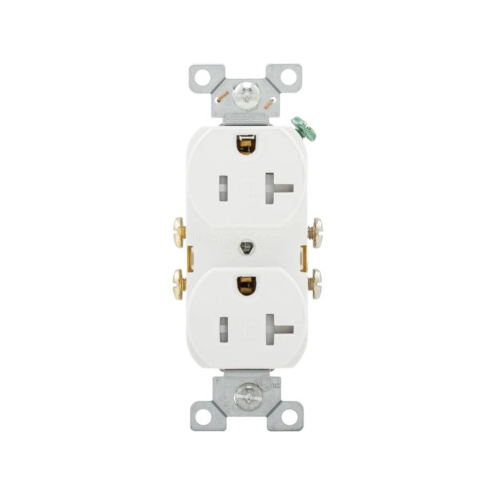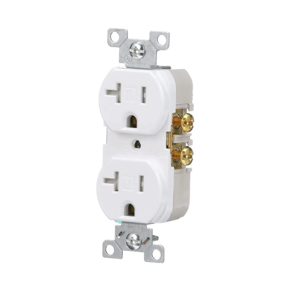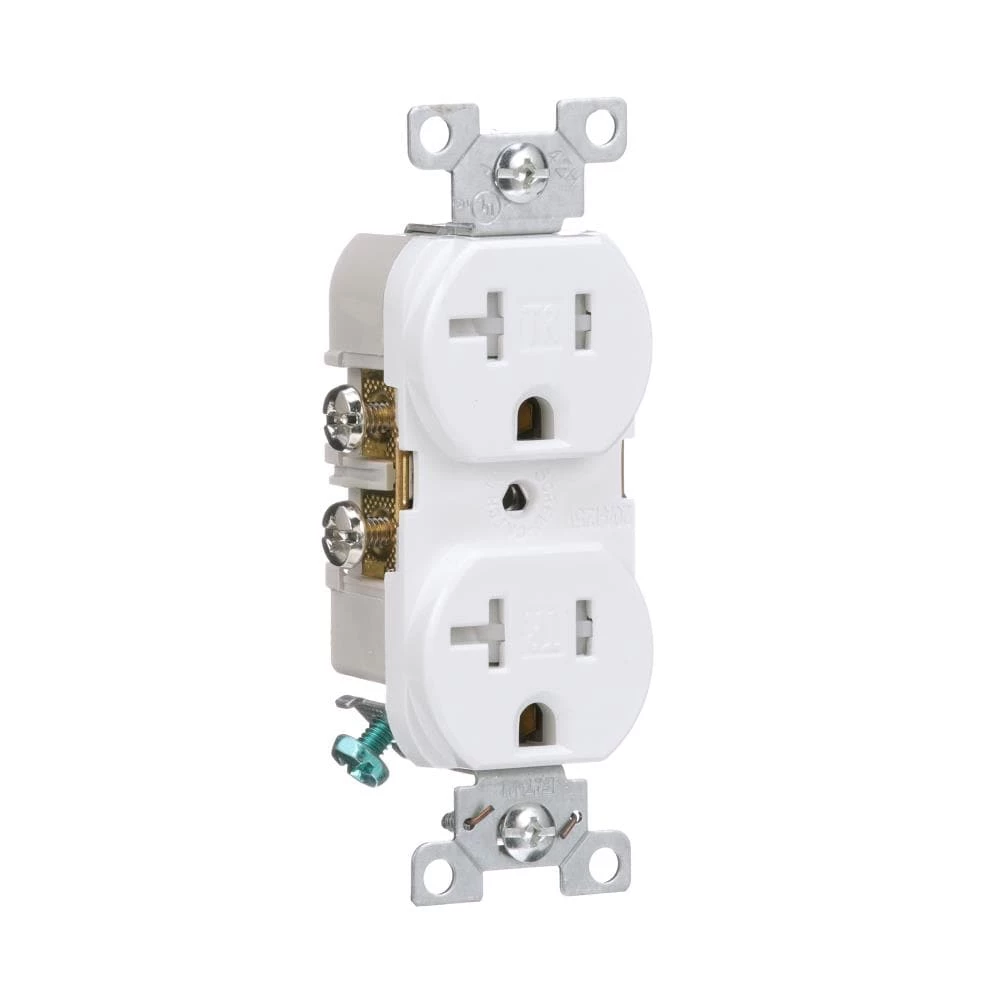 - White finish commercial grade duplex receptacle offers a 20A, 125V capacity designed to provide a dependable, long lasting user experience while increasing speed and efficiency of installation
